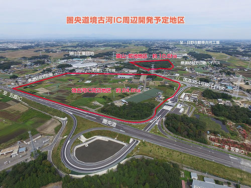 今年2月には圏央道の茨城県内区間が全線開通し,東名高速道路から東関東自動車道まで,東京から放射状に延びる6本の高速道路が圏央道で結ばれ,都心方面だけでなく,東北・中部・近畿方面へのアクセスも抜群に向上しました。さらに,境古河ICから約5kmに位置する日野自動車古河工場も全面稼働を開始するなど,当地域を取り巻く環境は大きく変わりつつあります。この交通アクセスを生かした物流・産業の拠点として,境古河IC周辺において産業用地の整備と企業誘致に積極的に取り組んでいるところです。 また当町は,立地条件の良さだけでなく,社員のみなさまが安心して移住・定住し,子育てができるような環境づくりも積極的に推進しています。 企業のみなさまの進出を全力でサポートしてまいりますので,当町への立地をぜひご検討ください。心よりお待ちしております。 【圏央道 境古河ICからのアクセス】
